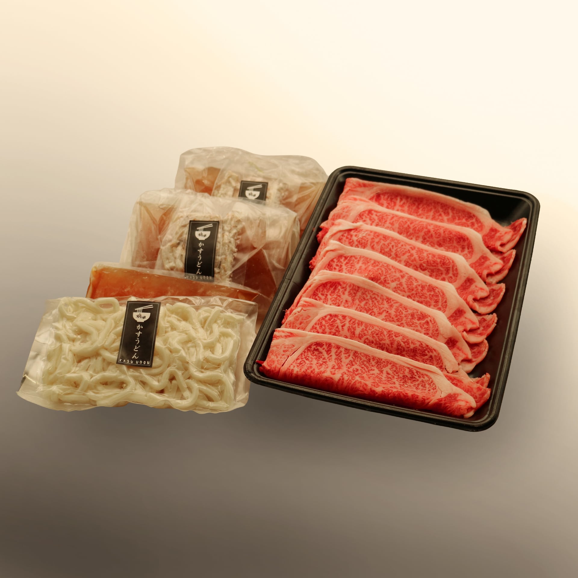 自家製の旨味が詰まったお肉と、もちもち食感のかすうどんがセットになったこの商品は、
